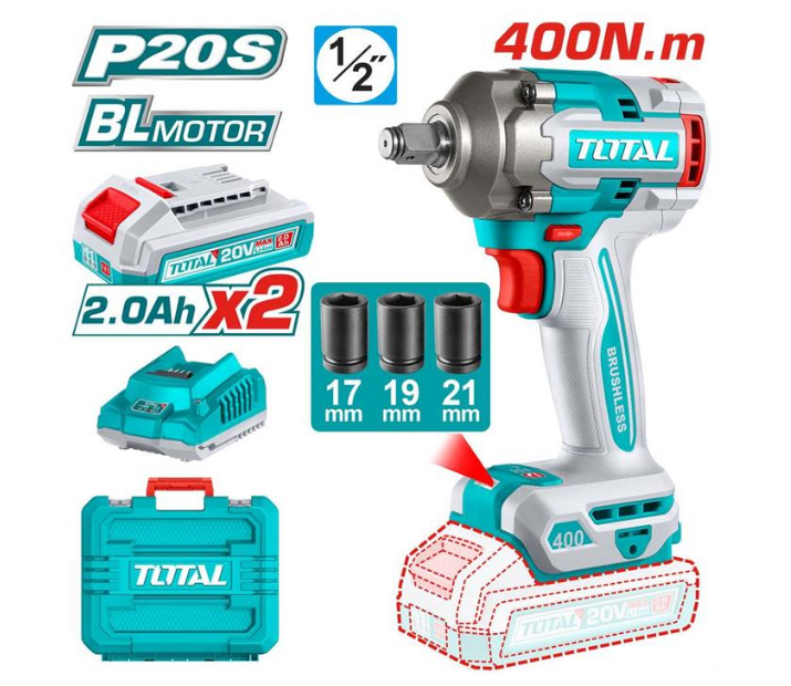 Avvitatore a impulsi brushless 20V – 1/2" – 400Nm – con batterie, carica e bussole. Motore brushless ad alte prestazioni Attacco quadro: 1/2" Velocità a vuoto: 0–1600 rpm 0–1900 rpm 0–2300 rpm Frequenza di impatto: 0–2100 bpm 0–2500 bpm 0–2900 bpm Coppia di serraggio: 400 Nm Coppia massima di svitamento (Nut-Busting): 550 Nm Luce LED integrata per l’illuminazione dell’area di lavoro Inclusi nella confezione: 2 batterie da 2.0Ah (modello TFBLI2001) 3 bussole: 17 mm, 19 mm, 21 mm 1 caricabatterie 20V (modello TFCLI2001E) Tensione di carica: 220–240V ~ 50/60Hz Fornito in valigetta per il trasporto