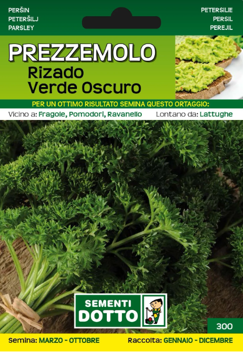 Il Prezzemolo Rizado Verde Oscuro è una pianta della famiglia delle Umbrelliferae, di origine euroasiatica. Radice fittonante, foglie composte, pennate, con piccioli lunghi. Fogliame ricciuto, stelo corto, lembo della foglia tagliuzzato, crespo, finemente dentellato, color verde scuro; molto produttivo. Consumato in cucina non solo come condimento ma anche per ornare i piatti da portata. Varietà a ciclo vegetativo medio-precoce.