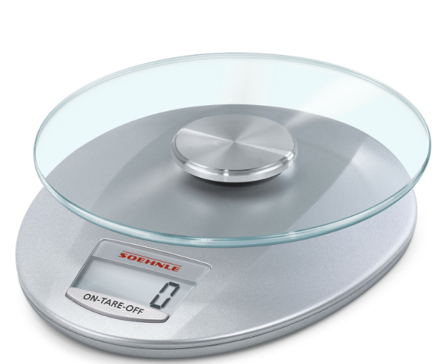 Bilancia da cucina digitale, modello Roma Silver, dotata di grande display LCD chiaramente leggibile, pratica funzione tare e piatto amovibile in vetro di sicurezza. Portata 5 kg. e massima precisione di pesatura con precisa gradazione di 1 gr.