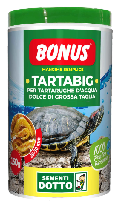 Bonus per Tartarughe Tartabig è un per mangime semplice per tartarughe d’acqua dolce di grossa taglia. Somministrare una o due volte al giorno un pizzico di mangime nella mangiatoia o direttamente nell’acqua (circa 2,5 g di mangime ogni 100 g di peso della tartaruga). COMPOSIZIONE: 100% Invertebrati acquatici (Macrobrachium ni nipponensis). Gamberi d’acqua dolce essiccati al sole. COMPONENTI ANALITICI: Proteina grezza 62,5% Oli e grassi grezzi 4,3% Fibra grezza 2,9% Ceneri grezze 17,8% Umidità 14,0% Calcio 2,46% Fosforo 1,2%