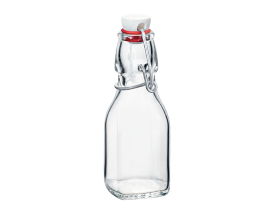 Bottiglia in vetro trasparente, linea Swing, con tappo meccanico a chiusura ermetica. Lavabile in lavastoviglie rimuovendo il tappo ad ogni lavaggio. LT 0,5