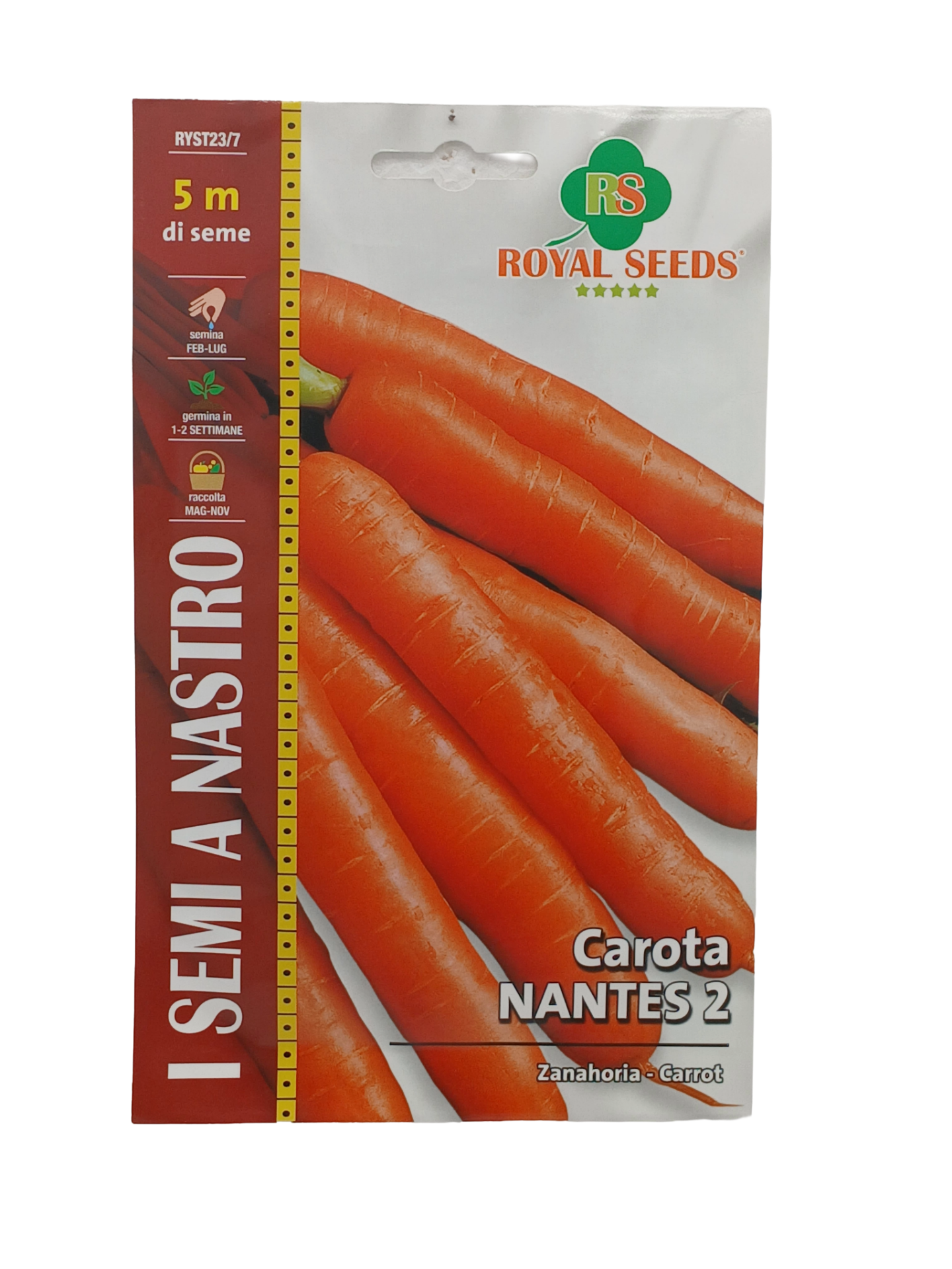 Carota NANTES 2 (Daucus carota L) Bella selezione medio precoce del tipo nantese, fogliame alto e robusto, radice di formazione cilindrica della lunghezza di 18-20 cm. Il colore arancio è molto bello ed intenso. Il cuore è tenero e croccante. Si semina a spaglio o a file distanti tra loro cm. 30 e cm. 2/3 sulla fila nel periodo da Febbraio a Luglio.