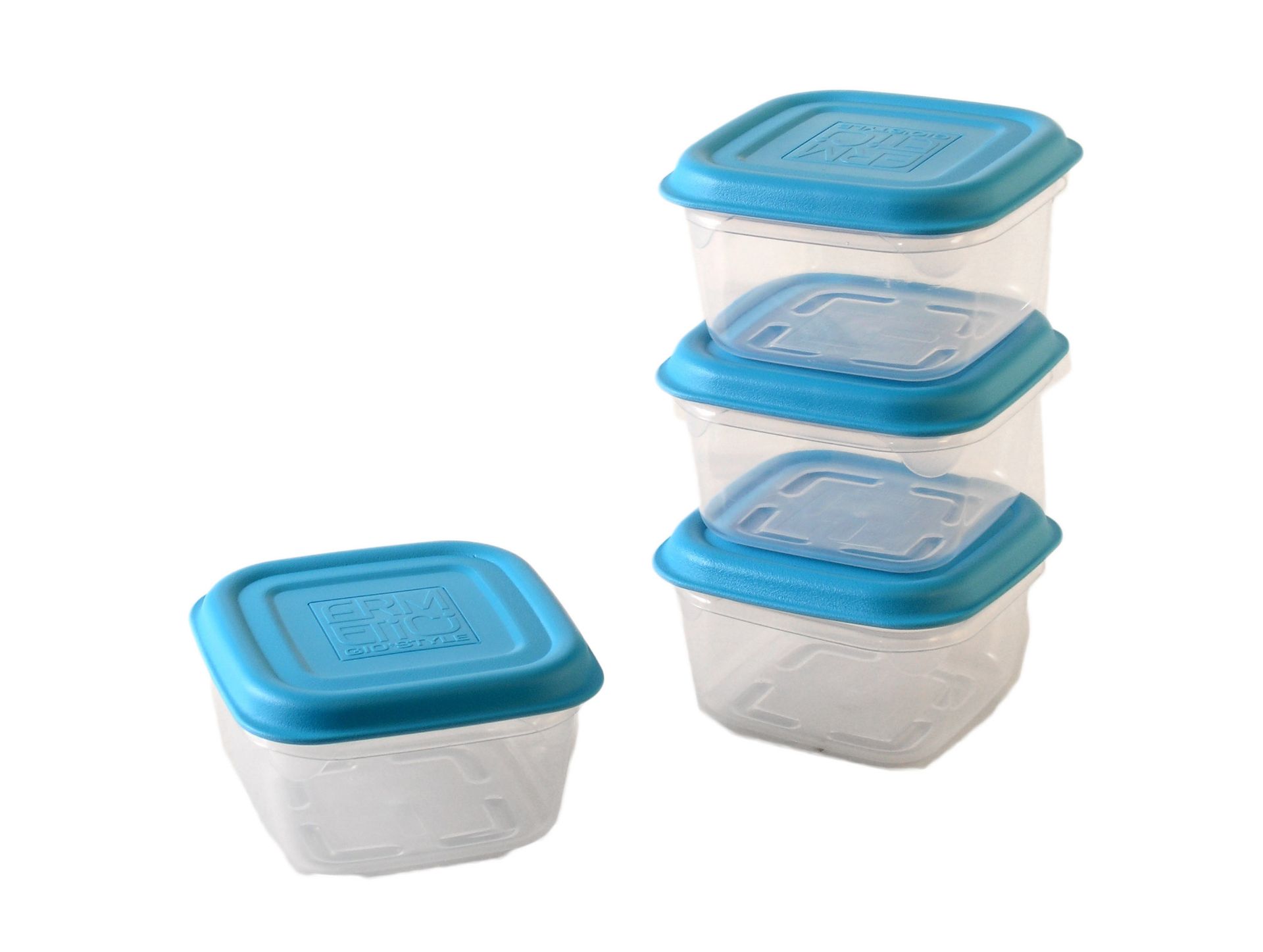 Confezione da 4 contenitori quadrati trasparenti, con coperchio blu ermetico in PEE resistente al gelo fino a -30°. Lt.0,25.