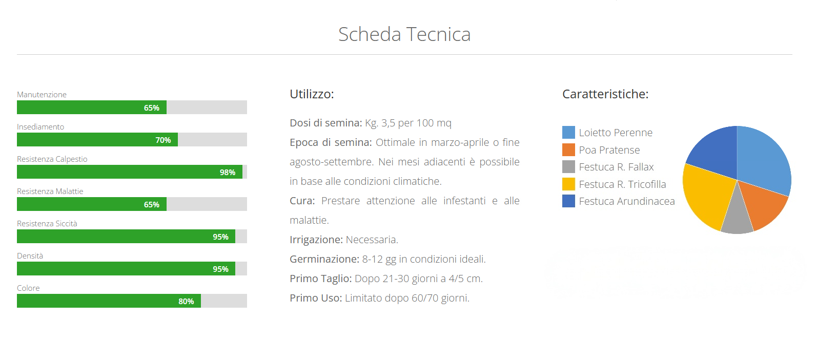 Destinazione: Campi sportivi, giardini residenziali Indicato per campi da calcio. Tipico manto erboso per campi da calcio e terreni sportivi. Molto resistente al forte calpestio e all’usura, può essere impiegato anche nei giardini residenziali molto utilizzati. Molto rustico, si adatta a tutti i climi. Quantità di seme: Kg. 3,5 per 100 mq.