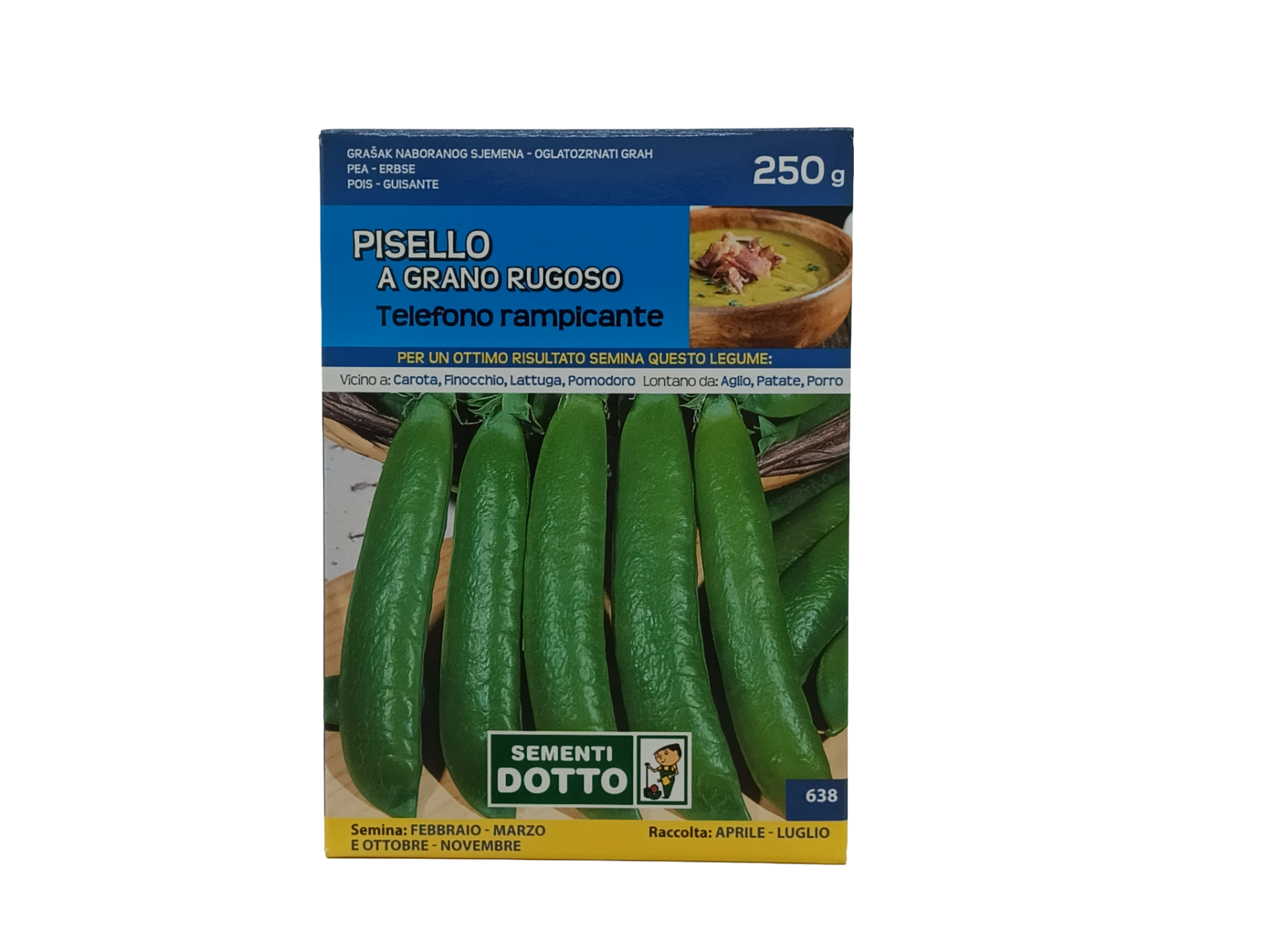Il Pisello a grano rugoso Telefono rampicante è una varietà tardiva. Pianta alta 180 cm. Baccello lungo 9-11 cm, contenente 8-9 grani color verde chiaro. Seme grosso e rugoso. Consigli per la coltivazione: Semina in campo: febbraio a maggio e da ottobre a novembre Raccolta: da aprile a luglio