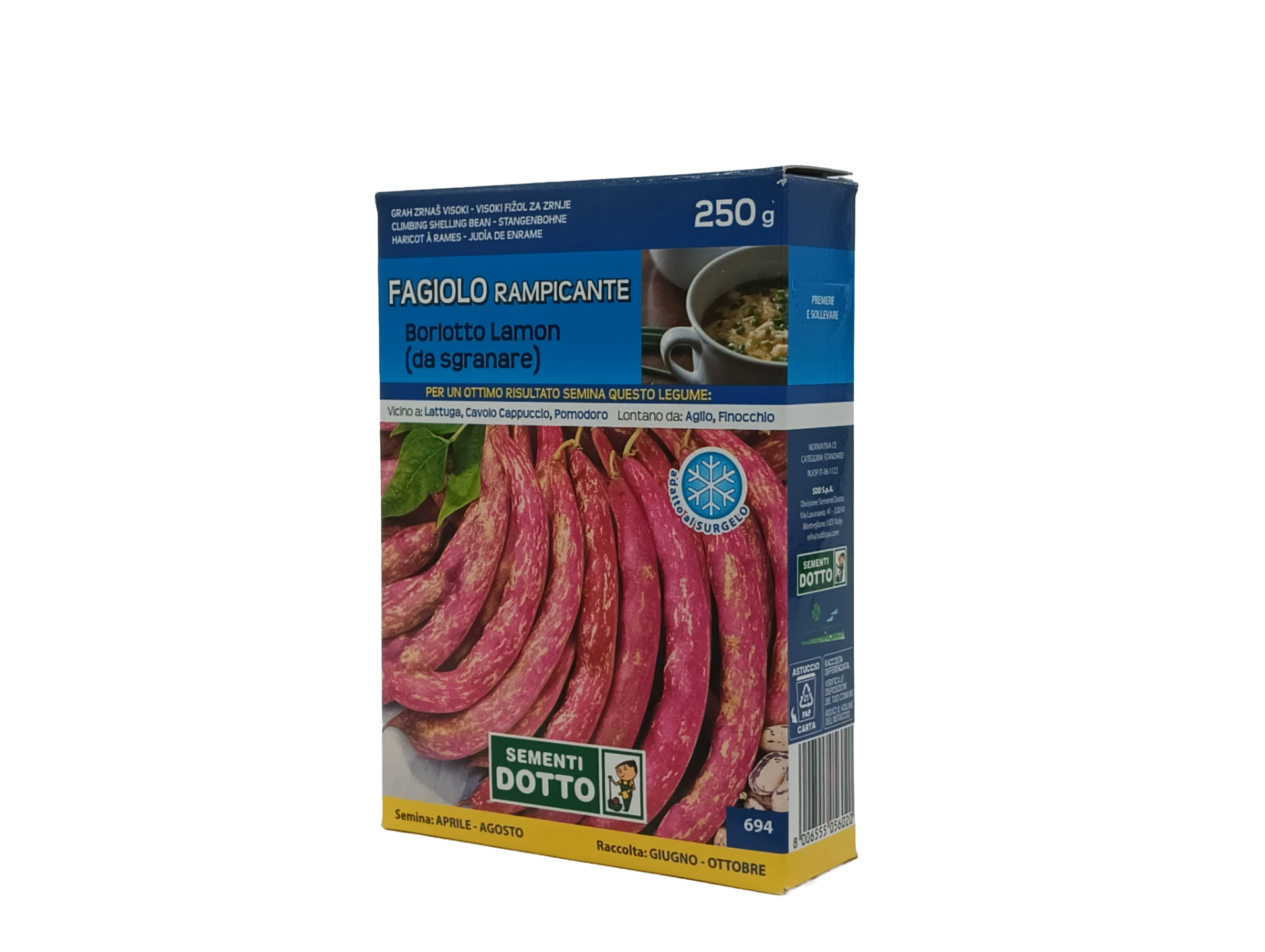 Il Fagiolo rampicante Borlotto Lamon è da sgranare. Presenta un baccello lungo, verde striato di rosso, a sezione ellittica schiacciata, superficie liscia, presenza di filo, stilo corto e diritto, 6/7 ovuli per baccello. Seme di grossa mole, sezione longitudinale ovoidale allungata, sezione trasversale leggermente appiattita, color carnicino striato rosso vinaceo, presenza di venature. Consigli per la Semina: Semina protetta: marzo Semina all’aperto: da aprile ad agosto Raccolta: da giugno a ottobre