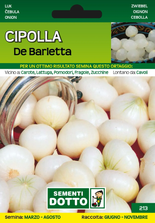 La Cipolla de Barletta è una pianta della famiglia delle Liliaceae bulbosa, biennale per la produzione del seme, annuale per l’ottenimento del bulbo; con radici molto sviluppate, ramificate, superficiali. Ha foglie tubolari, cerose, bulbo con buccia e polpa bianca senza striature; di forma piatta medio grossa. Secondo le modalità di coltivazione può essere adatta alla produzione di sottaceti. Scarsa conservabilità. Ciclo vegetativo precoce.