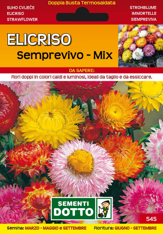 L’Elicriso Semprevivo (in miscuglio) è una pianta annuale rustica con foglie lanceolate. I fiori lunghi fino a 5 cm sono particolarmente indicati per essere essicati. Consigli per la Semina: -Semina protetta: febbraio -Semina all’aperto: da marzo a maggio e a settembre -Fioritura: da giugno a settembre