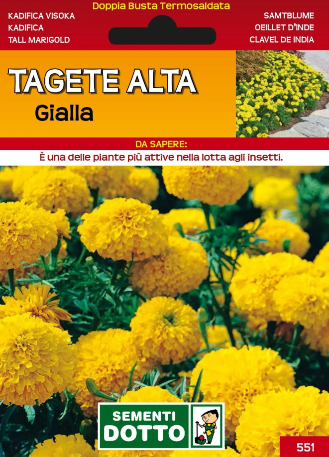La Tagete Alta Gialla è una pianta annuale rustica, con fogliame elegante ed ornamentale, setato. Fiori gialli numerosi ed eretti a fioritura prolungata. -Consigli per la Semina: -Semina protetta: febbraio/marzo -Semina all’aperto: aprile/maggio -Fioritura: da maggio a settembre