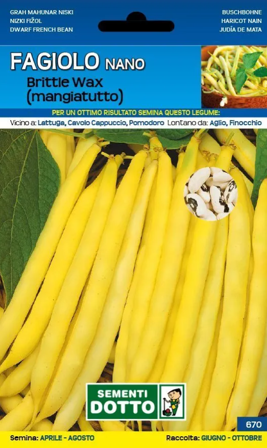 Il Fagiolo nano Brittle Wax (mangiatutto) presenta baccello di media lunghezza, giallo, a sezione trasversale rotonda, superficie liscia e assenza di filo; strozzatura tra i semi accennata, stilo corto incurvato, 5/7 ovuli per baccello. Seme di media mole, colore bianco con mosca nera. -Consigli per la Semina: -Semina protetta: marzo -Semina all’aperto: da aprile ad agosto -Raccolta: da giugno a ottobre