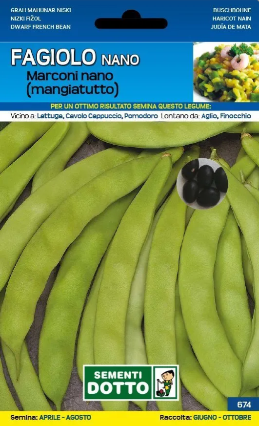 Il Fagiolo nano Marconi nano a seme nero (mangiatutto) presenta baccello di media lunghezza, verde, a sezione trasversale piatta, superficie liscia e assenza di filo; strozzatura tra i semi presente, stilo diritto corto, 5/6 ovuli per baccello. Seme di grossa mole, nero con contorno dell’ilo e aureola neri. -Consigli per la Semina: -Semina protetta: marzo -Semina all’aperto: da aprile ad agosto -Raccolta: da giugno a ottobre