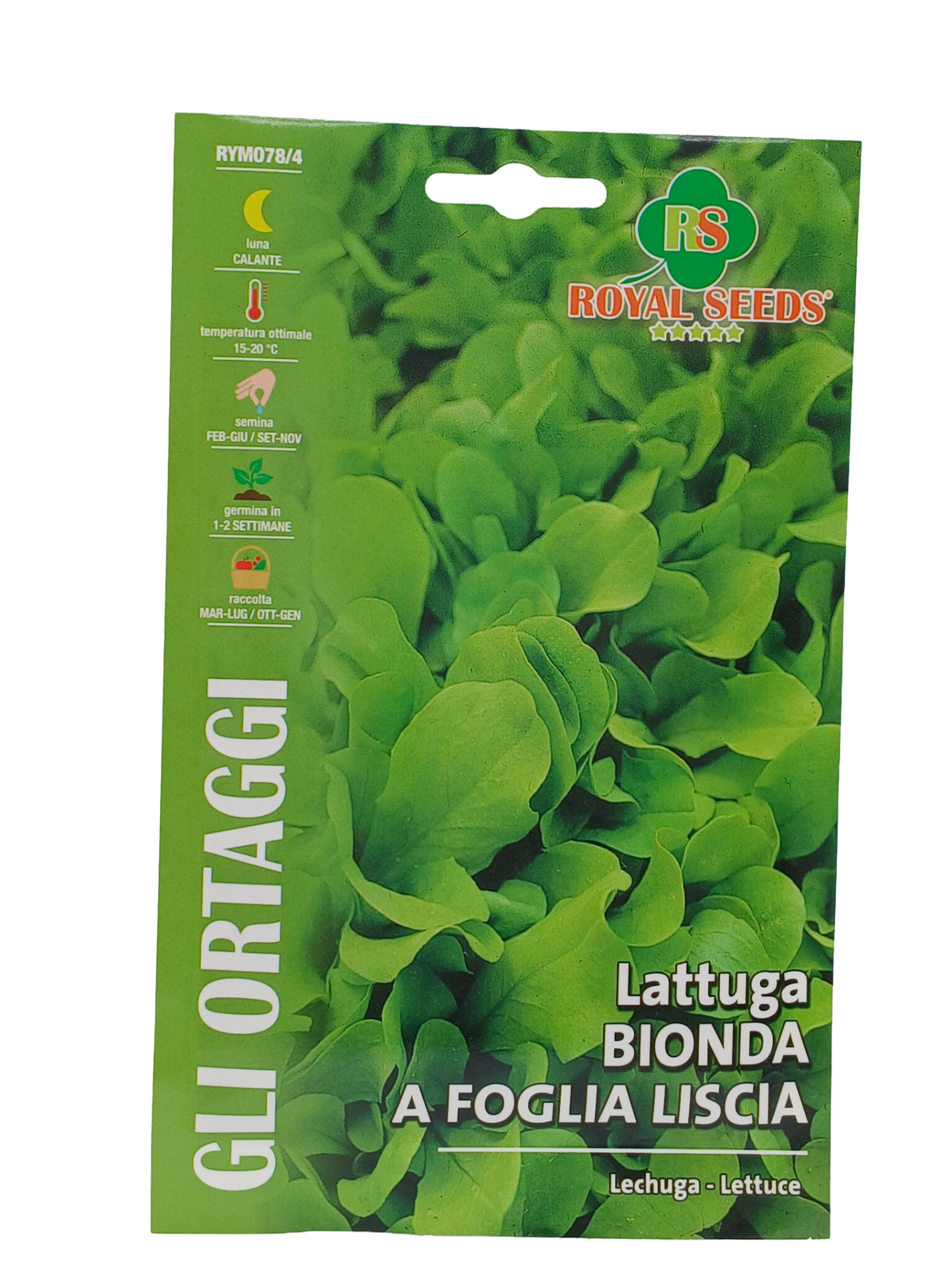 Lattuga BIONDA A FOGLIA LISCIA (Lactuca sativa L.) Nuova selezione a foglie di un bel colore verde biondo con spiccata attitudine al ricaccio, si presta a 7/8 tagli successivi, molto precoce, si raccoglie dopo circa 30 giorni dalla semina con foglie a circa 10 cm di sviluppo. Semina a spaglio dalla primavera all'autunno. Si consiglia di sospendere la semina nei periodi più caldi dell'anno a luglio/agosto.