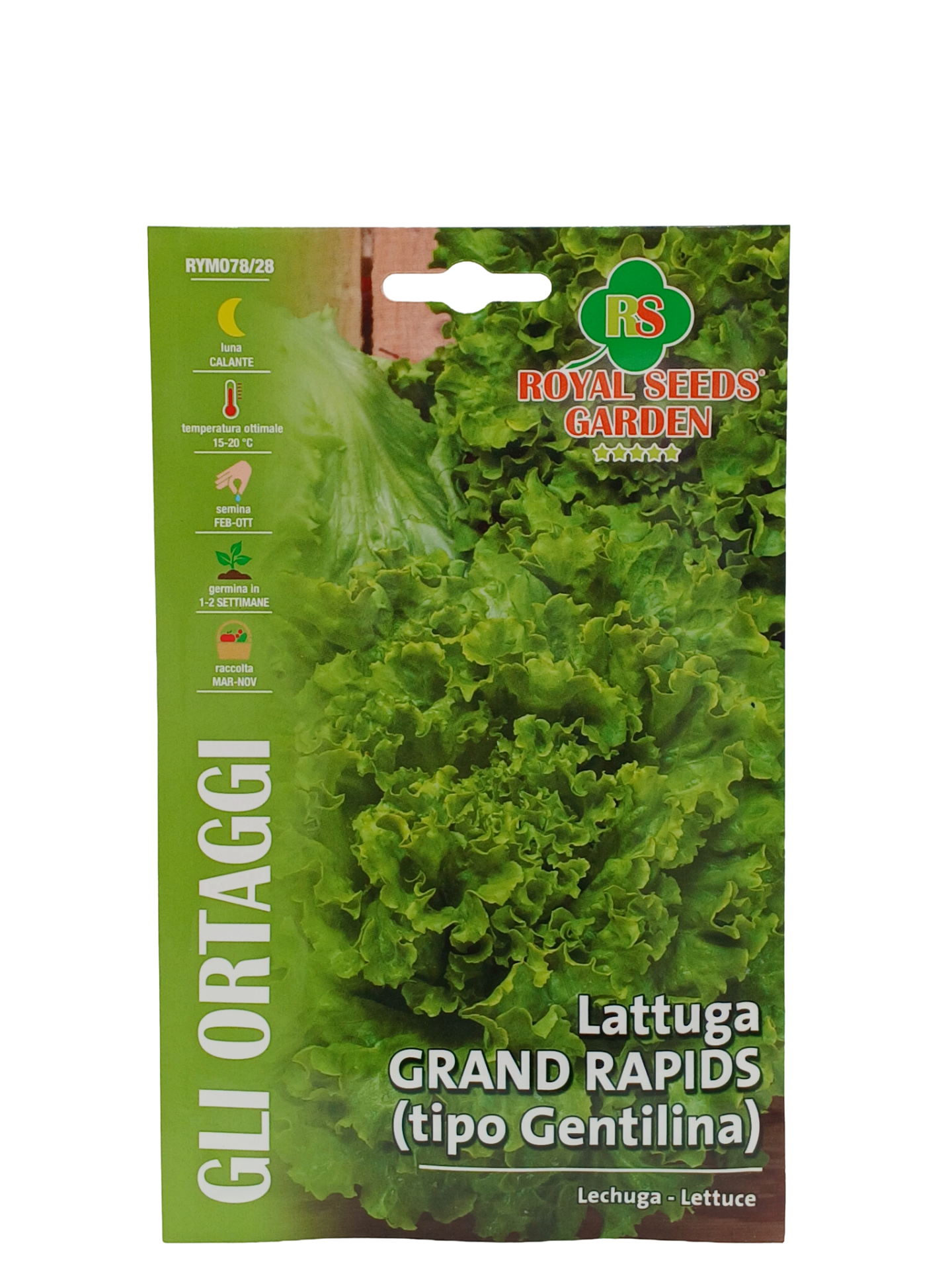 Lattuga GRAND RAPIDS (tipo Gentilina) (Lactuca sativa L.) Varietà di lattuga professionale da cespo e da taglio, È di un bel colore verde biondo. La sua grande resistenza a montare a seme e la facilità di crescita a basse temperature, la rendono idonea pia alla coltivazione in serra che estiva in pieno campo. Si semina a epaglio implegando 2 - 3 gr x mq e si taglia dopo 25/30 giorni; ricaccia rapidamente dopo ogni raccolta, Si può coltivare sommando a fin di 35 - 40 cm e diradando a cm 25. In questo caso la maturazione si raggiunge dopo 45 - 50 giorni.
