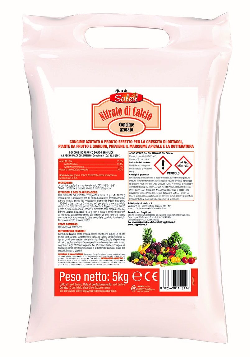 Concime Nitrato di Calcio della linea Fleur du Soleil di Raggio di Sole è un concime granulare a base di azoto nitrico (N 15,5 + CaO 26,3) a pronto effetto che induce un effetto starter alle colture, consente una spiccata azione antiasfissiante su terreni umidi o compattati e riduce i danni da freddo. Grazie alla presenza di Calcio esplica anche una azione positiva sulla consistenza dei tessuti vegetali e sugli standard organolettici di frutti e ortaggi. Previene il marciume apicale e la butteratura amara. Ideale per ortaggi, frutteti e giardini.