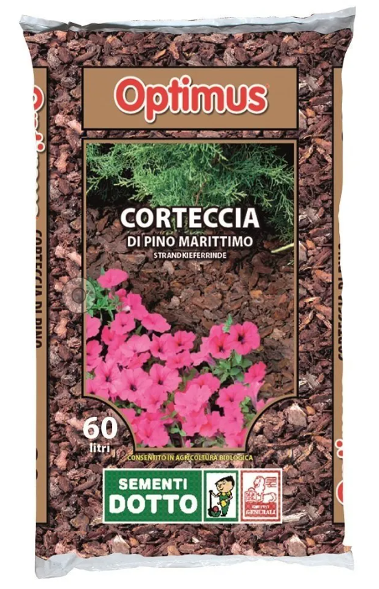 Optimus Corteccia di pino marittimo è un ammendante vegetale semplice non compostato costituito da pure cortecce di pino marittimo. È un prodotto totalmente ecologico di prima qualità da utilizzarsi a scopo decorativo e per la pacciamatura di vasi, aiuole, giardini, lungo i viali, nei parchi, ecc.