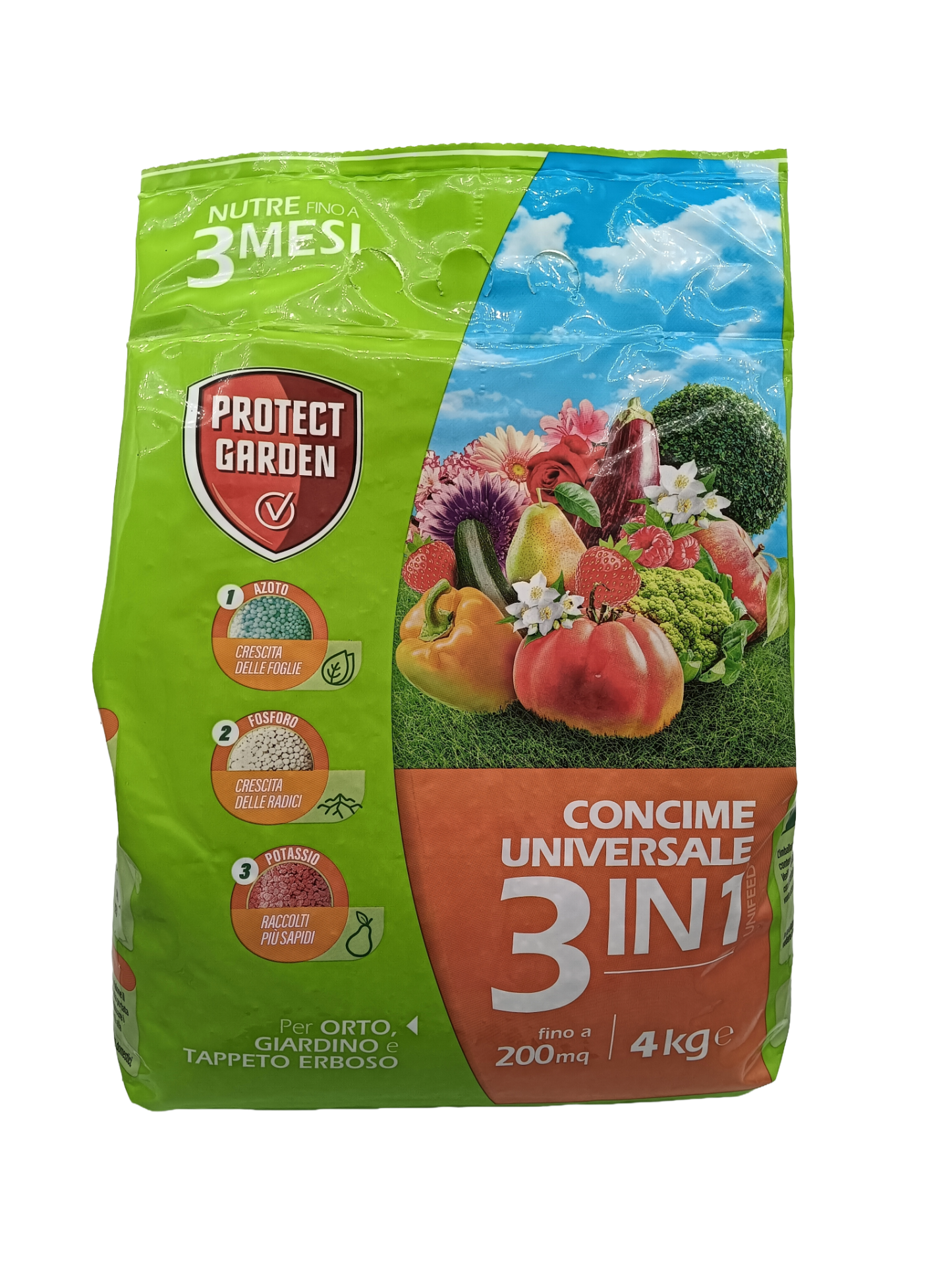 Concime Universale - Nutre 3 mesi Il Concime Protect Garden 3in1 è un granulare a basso cloro che nutre fino a 3 mesi orto, frutteto e giardino. Grazie all'inibitore dell'ureasi NBPT prolunga l'efficacia della concimazione azotata aumentando resa ed efficienza. Il supporto biodegradabile in Calciprill non lascia residui e non imbratta. Contiene anche zolfo e calcio, bilanciando il pH del suolo. + Nutre fino a 3 Mesi + Arricchito con zolfo e calcio