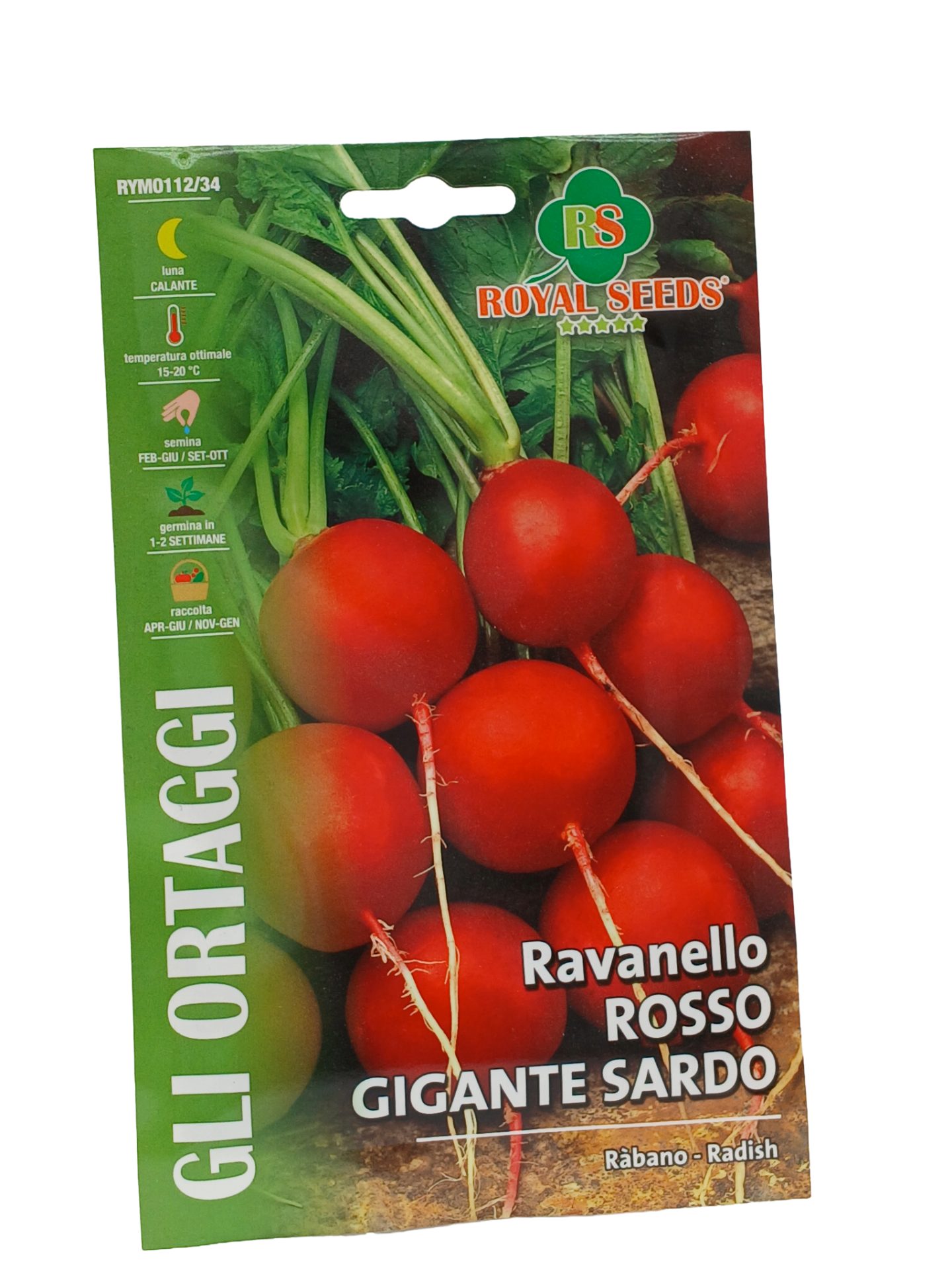 Ravanello ROSSO GIGANTE SARDO (Raphanus sativus L) Varietà con buona precocità, a radico perfettamente sferica e di grosse dimensione, colore rosso carico. Non svuota facilmente. La polpa risulta essere molto croccante e saponta. L'apparato fogliare è di medio sviluppo, Si semina a file distanti tra di loro circa 20 cm e cm 3/5 sulla fila nei mesi di marzo/ottobre.