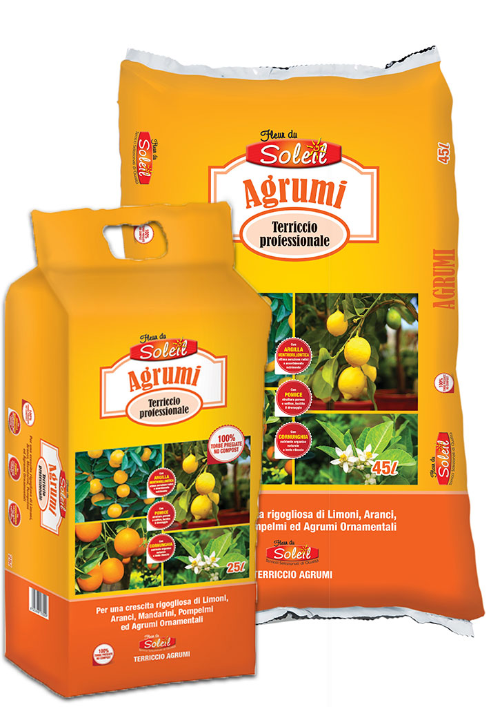 Terriccio per Agrumi della linea Fleur du Soleil di Raggio di Sole è un substrato specifico per la coltura di tutte le piante di agrumi (limone, mandarino, arancio, pompelmo, kumquat) in vaso ed in piena terra. Terriccio soffice e poroso, composto da una miscela selezionata di elevata qualità di pregiate torbe bionde, che per il loro grado di umificazione e per l’aggiunta di cornunghia forniscono alle radici tutti gli elementi nutritivi indispensabili per una crescita sana ed equilibrata della pianta, per radici sane e per abbondanti fioriture e fruttificazioni. Garantisce un ottimale sviluppo radicale, una fioritura rigogliosa ed una ricca fruttificazione. Con argilla e pomice per facilitare il drenaggio e un ottima areazione delle radici. È pronto all’uso; semplice da dosare, utilizzabile tutto l’anno sia in occasione di aggiunte periodiche che per il rinvaso.