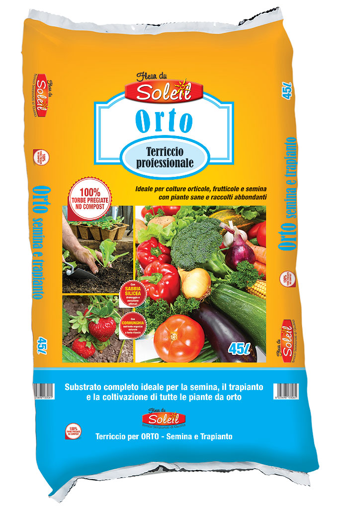Terriccio per Orto della linea Fleur du Soleil di Raggio di Sole è un substrato organico di alta qualità ottenuto esclusivamente dalla miscelazione di pregiate torbe fini nere e bionde con un diverso grado di umificazione e sabbia silicea di fiume. Per le caratteristiche fisiche e chimiche delle materie prime impiegate, per il loro dosaggio e per la perfetta ed equilibrata miscelazione, risulta essere un terriccio a struttura fine, soffice e drenante, particolarmente indicato per la preparazione dei terreni di semina e per i trapianti e la coltivazione nella cassette, vassoi, tunnel, serre calde e fredde ed in pieno campo. Grazie all’aggiunta di cornunghia, concime organico naturale a lenta cessione, fornisce alle radici tutti gli elementi nutrivi indispensabili per una crescita sana delle piante da orto e per produzioni e raccolti abbondanti di frutti e ortaggi.