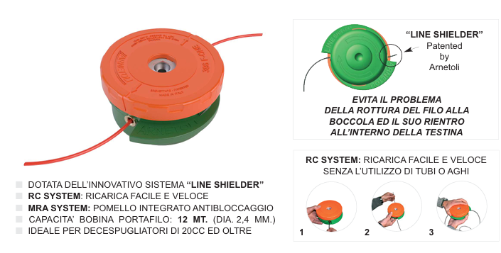 DOTATA DELL’INNOVATIVO SISTEMA “LINE SHIELDER” . RC SYSTEM: RICARICA FACILE E VELOCE . MRA SYSTEM:POMELLO INTEGRATO ANTIBLOCCAGGIO . CAPACITA’ BOBINA PORTAFILO: 12 MT. (DIA. 2,4 MM.) . IDEALE PER DECESPUGLIATORI DI 20CC ED OLTRE. ATTENZIONE SENZA ADATTATORE
