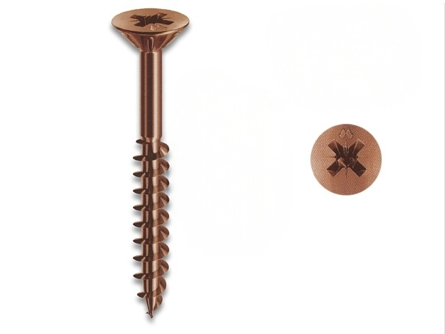 Vite Panel-Vit PF. Testa svasata piana a croce, bronzata. Indicata per realizzare fissaggi tra parti di elevato spessore. Azione svasante delle alette sotto testa per permettere un perfetto alloggiamento.